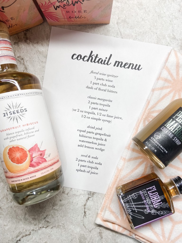 A fun activity for girls’ night in is to try new cocktails that you wouldn’t typically make – because let’s be real, most of our get togethers just involve popping the cork on a bottle of wine. I printed off a cocktail menu and had all the ingredients ready to go so the girls could easily whip up their new favorite drink. We used 21 Seeds infused tequila (a women owned company!) for flavored margaritas & cocktails and Strongwater floral bitters for wine spritzers. The crowd favorite was the valencia orange infused tequila – add a splash of club soda and orange juice and you have your new favorite way to drink tequila.